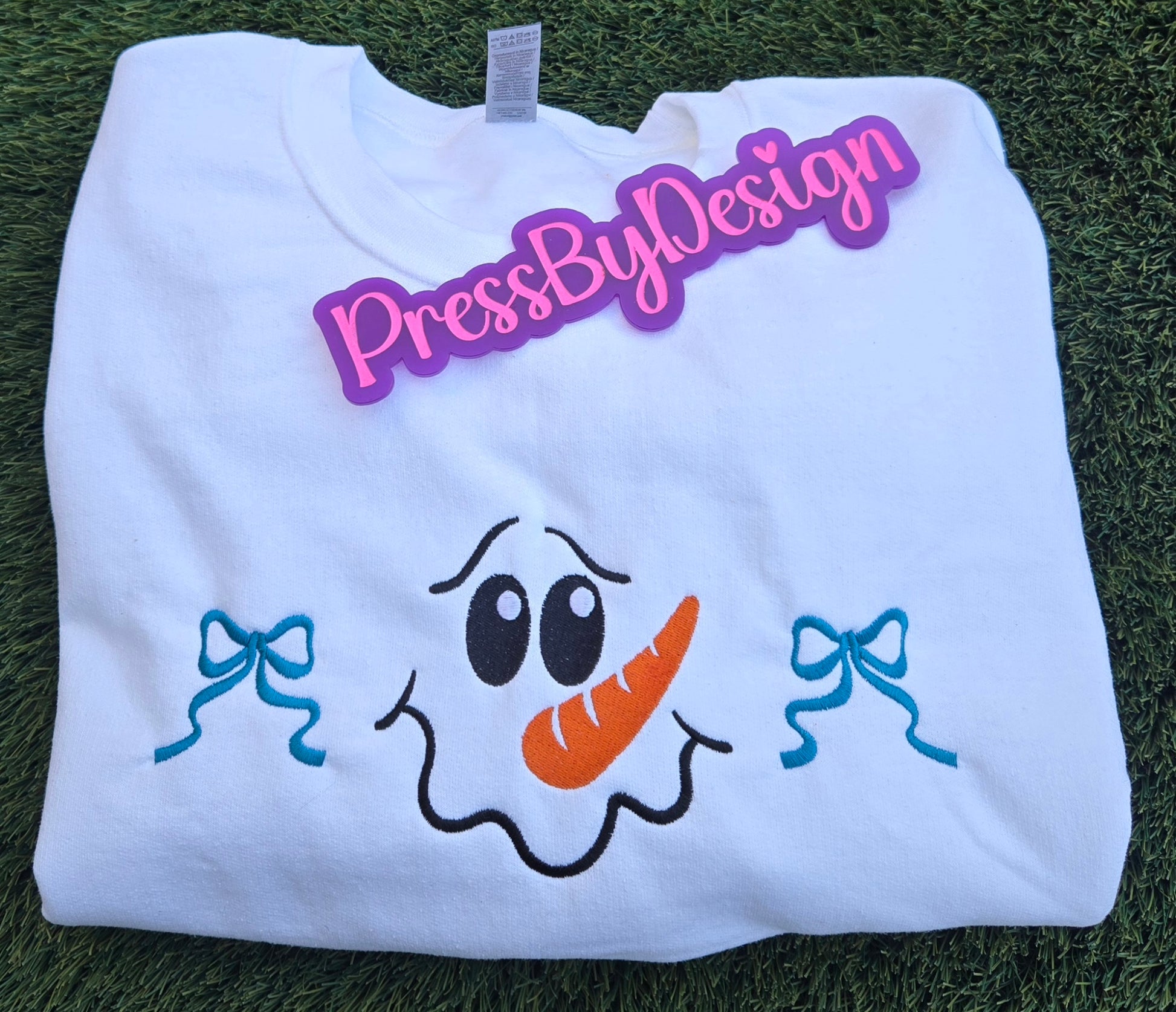Celebrate the holidays in style with this adorable Christmas sweatshirt! Featuring a charming snowman face adorned with cute bows on both sides, it's made from a super soft, cozy blend of 50% cotton and 50% polyester for all-day comfort.
