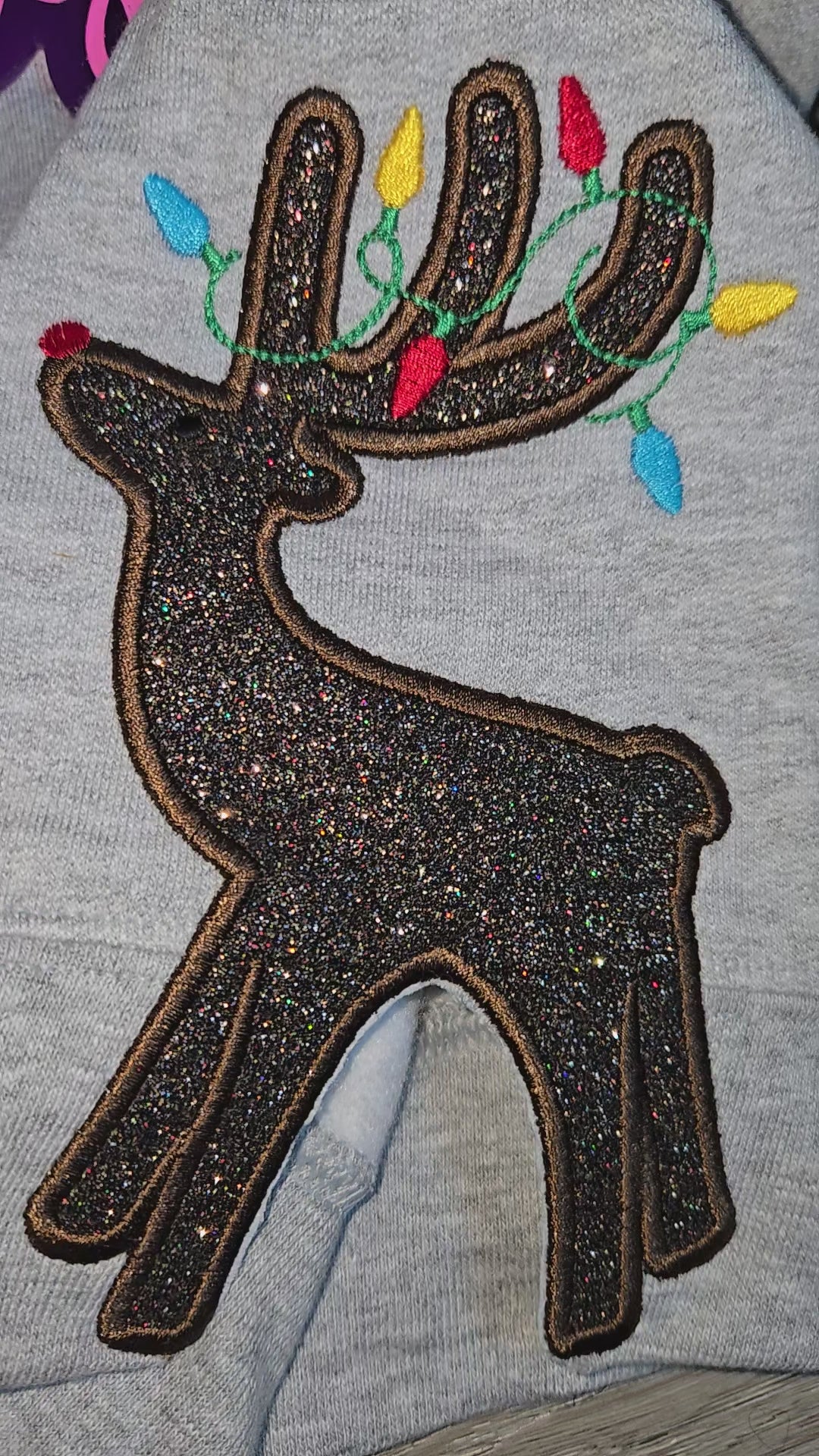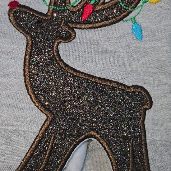 Get in the holiday spirit with our festive Christmas sweatshirt! Featuring embroidered glitter deer appliques on both sides, complete with Christmas lights strung through their antlers. Available in sandstone, black, and gray. Spread some cheer with the embroidered "Merry" and "Christmas" in red on the chest.